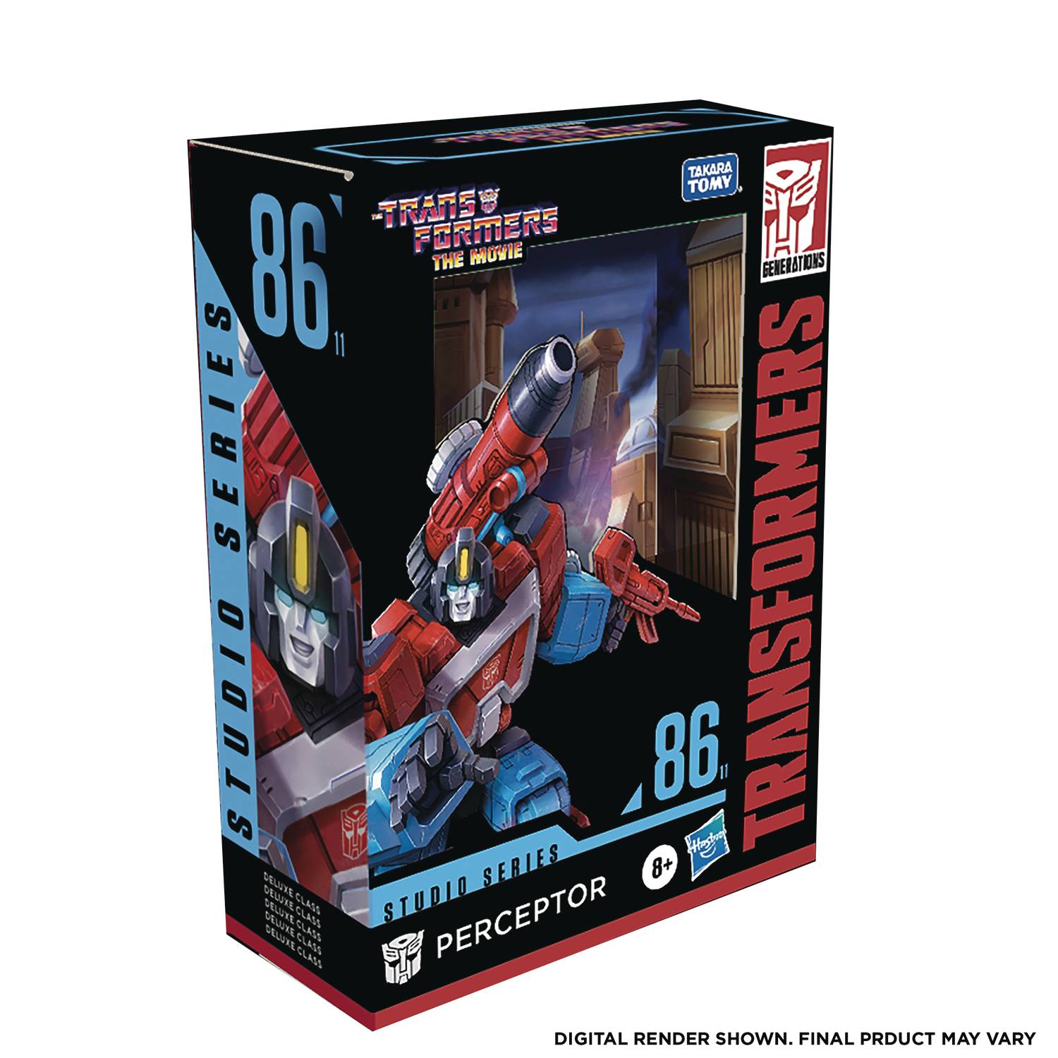 This Studio Series 86-11 Deluxe Class Transformers: The Movie-inspired Perceptor figure converts from robot to microscope mode in 20 steps. Remove backdrop to showcase Perceptor in the Battle of Autobot City scene. In the Battle of Autobot City scene from The Transformers: The Movie, Perceptor observes a fleet of incoming enemies. His cursory evaluation of Decepticon capability indicates a distinct tactical deficiency—or in other words: the Autobots are outnumbered! Pose the figure out with the included blaster accessory and imagine recreating this classic movie moment!